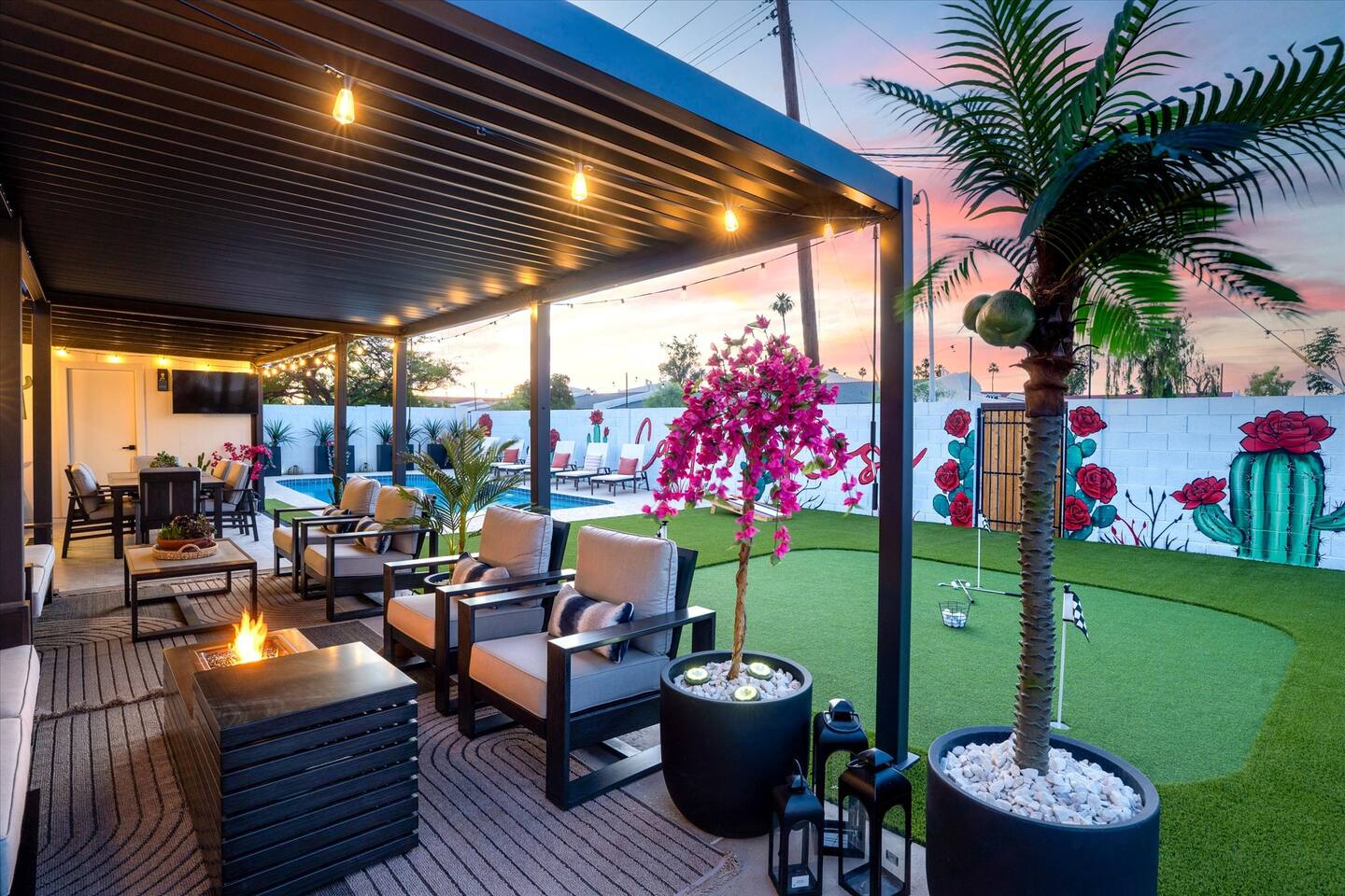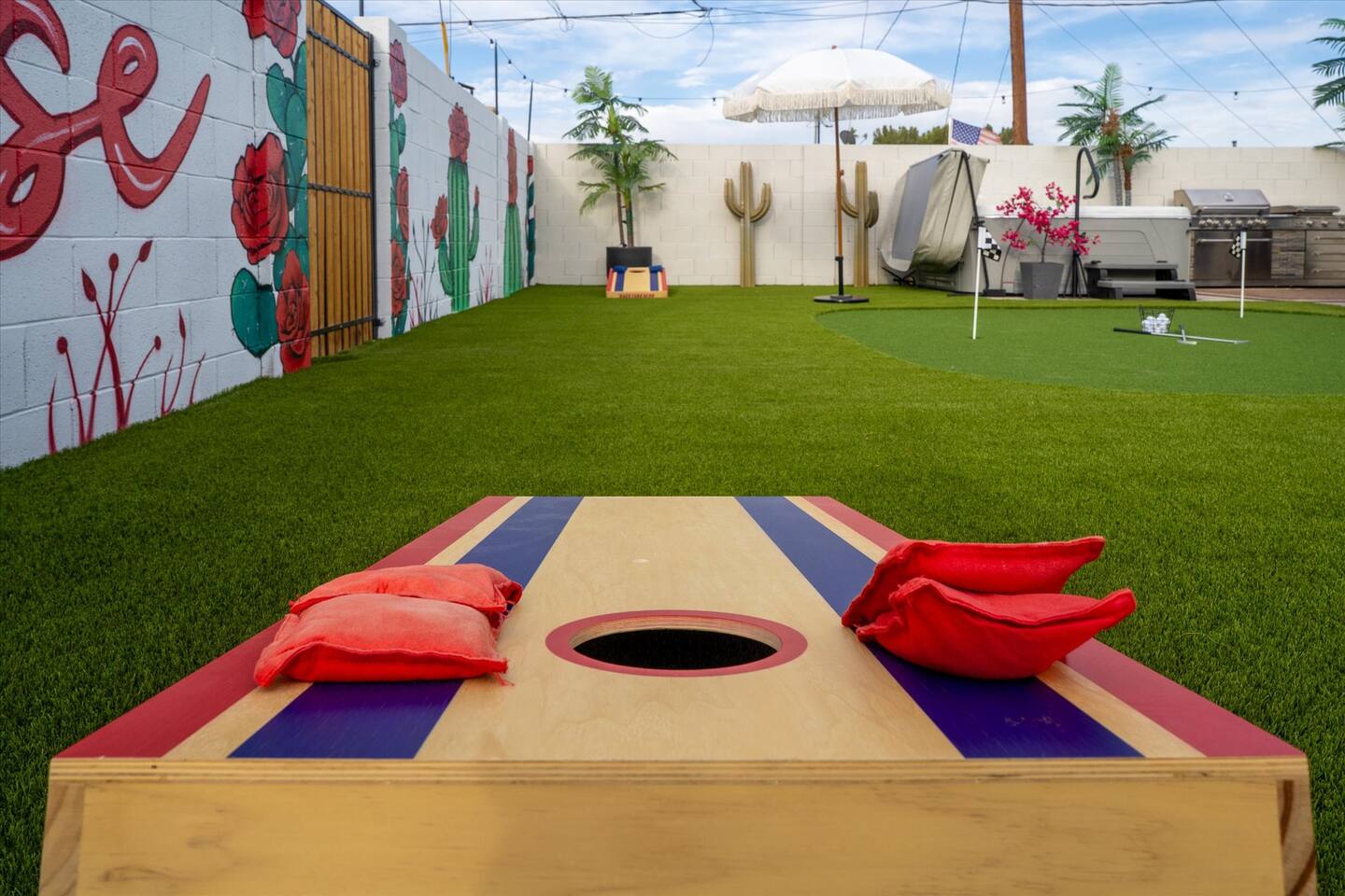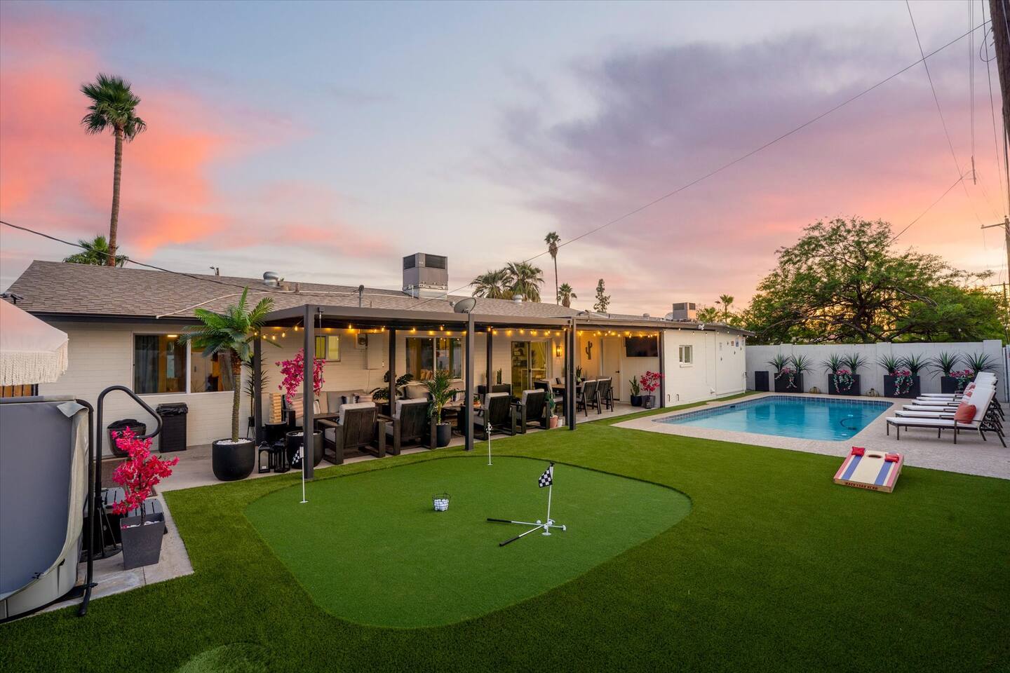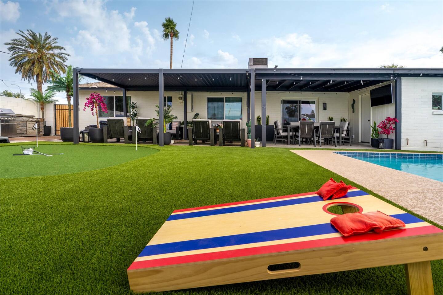 - Relax in a backyard oasis with a pool, hot tub, and built-in grill setup. - Enjoy mini-golf, Corn Hole, and a fire pit in the family-friendly backyard. - Unwind in stylish rooms with modern decor, TVs, and room-darkening curtains. - Minutes from ASU, local attractions, dining, and shopping in vibrant Tempe. - Reserve your desert retreat now for a blend of adventure and relaxation!