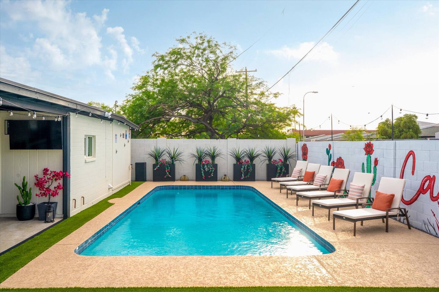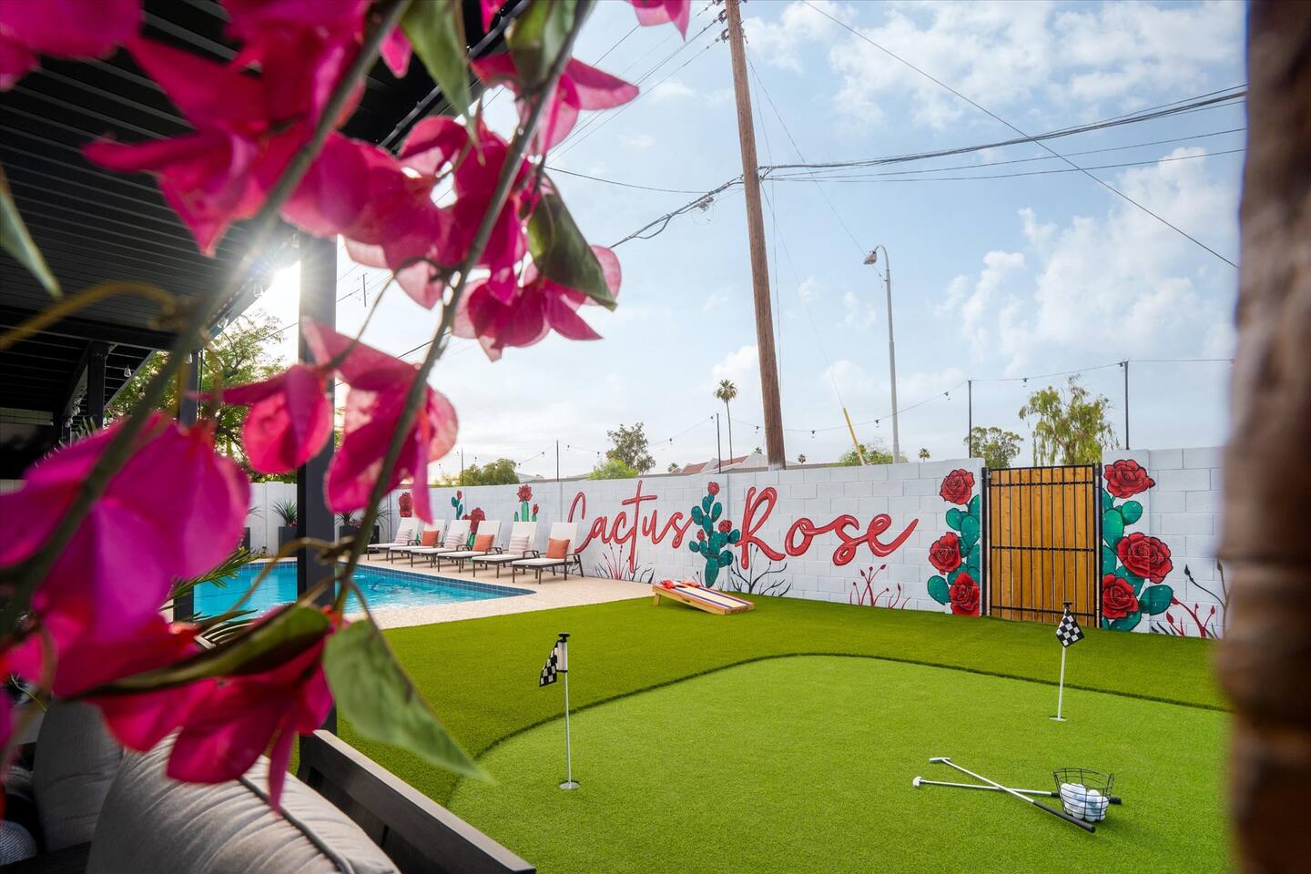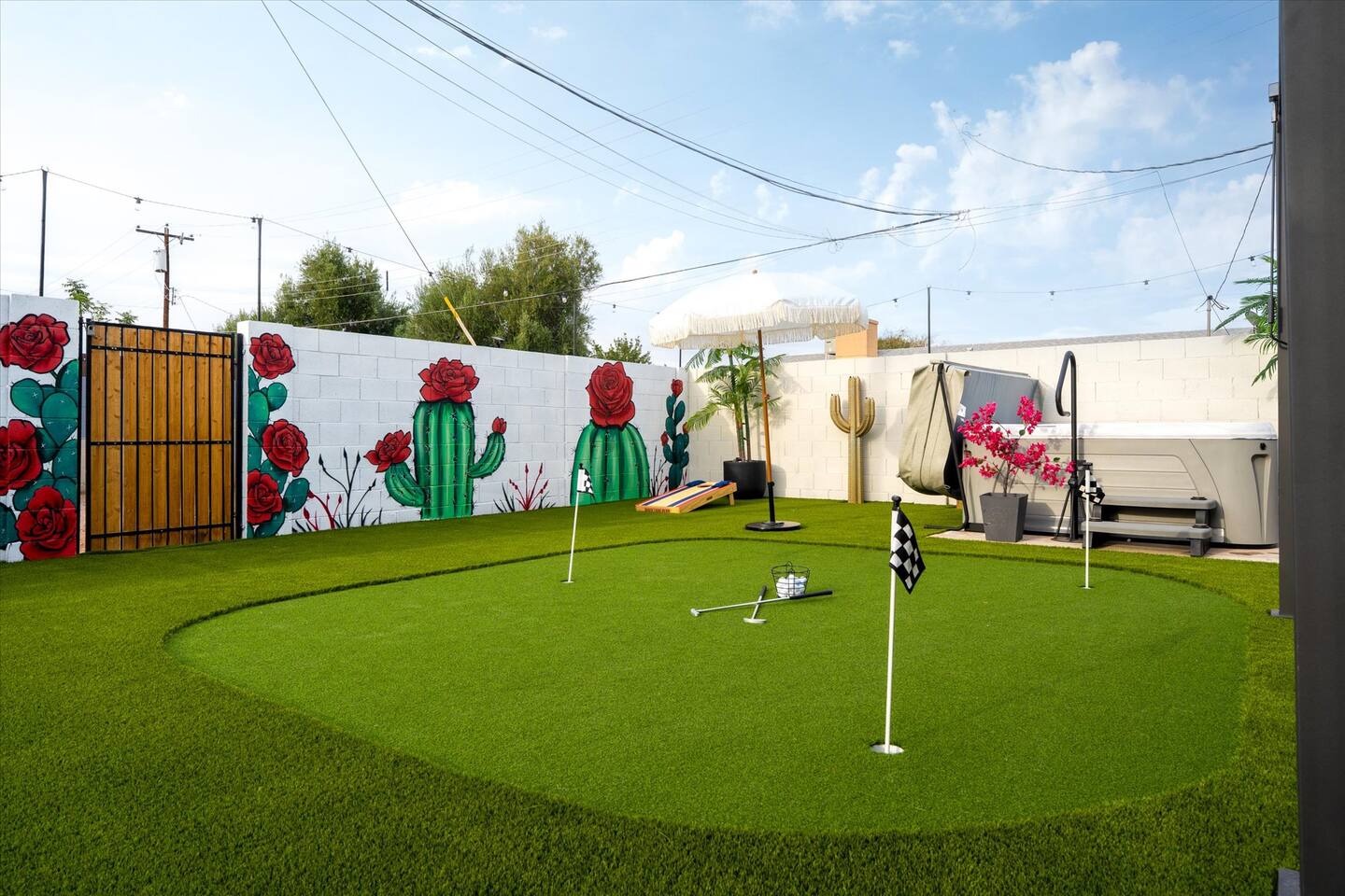 - Relax in a backyard oasis with a pool, hot tub, and built-in grill setup. - Enjoy mini-golf, Corn Hole, and a fire pit in the family-friendly backyard. - Unwind in stylish rooms with modern decor, TVs, and room-darkening curtains. - Minutes from ASU, local attractions, dining, and shopping in vibrant Tempe. - Reserve your desert retreat now for a blend of adventure and relaxation!