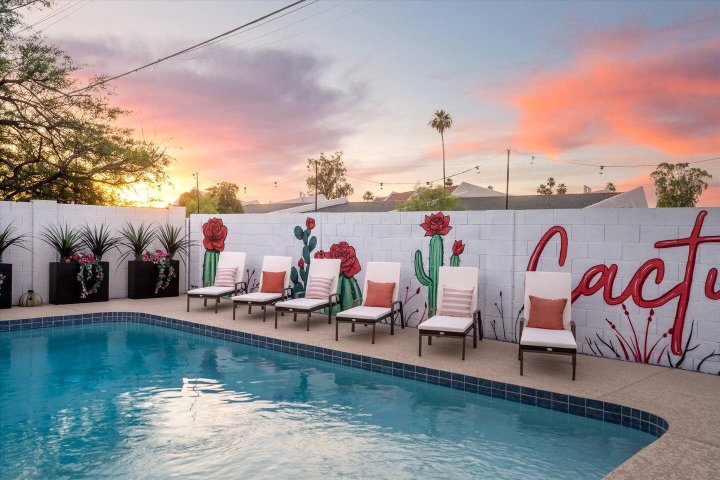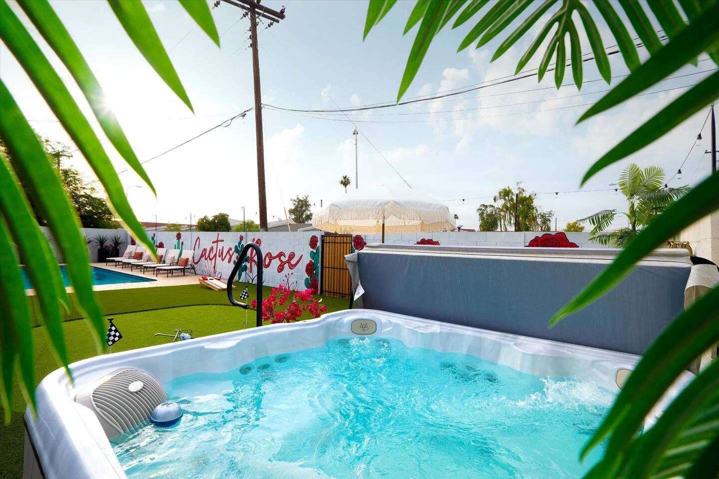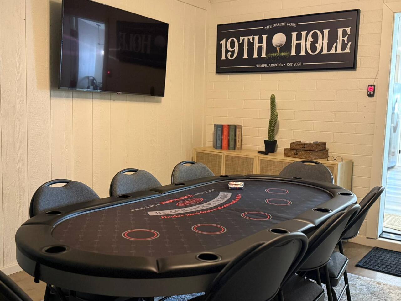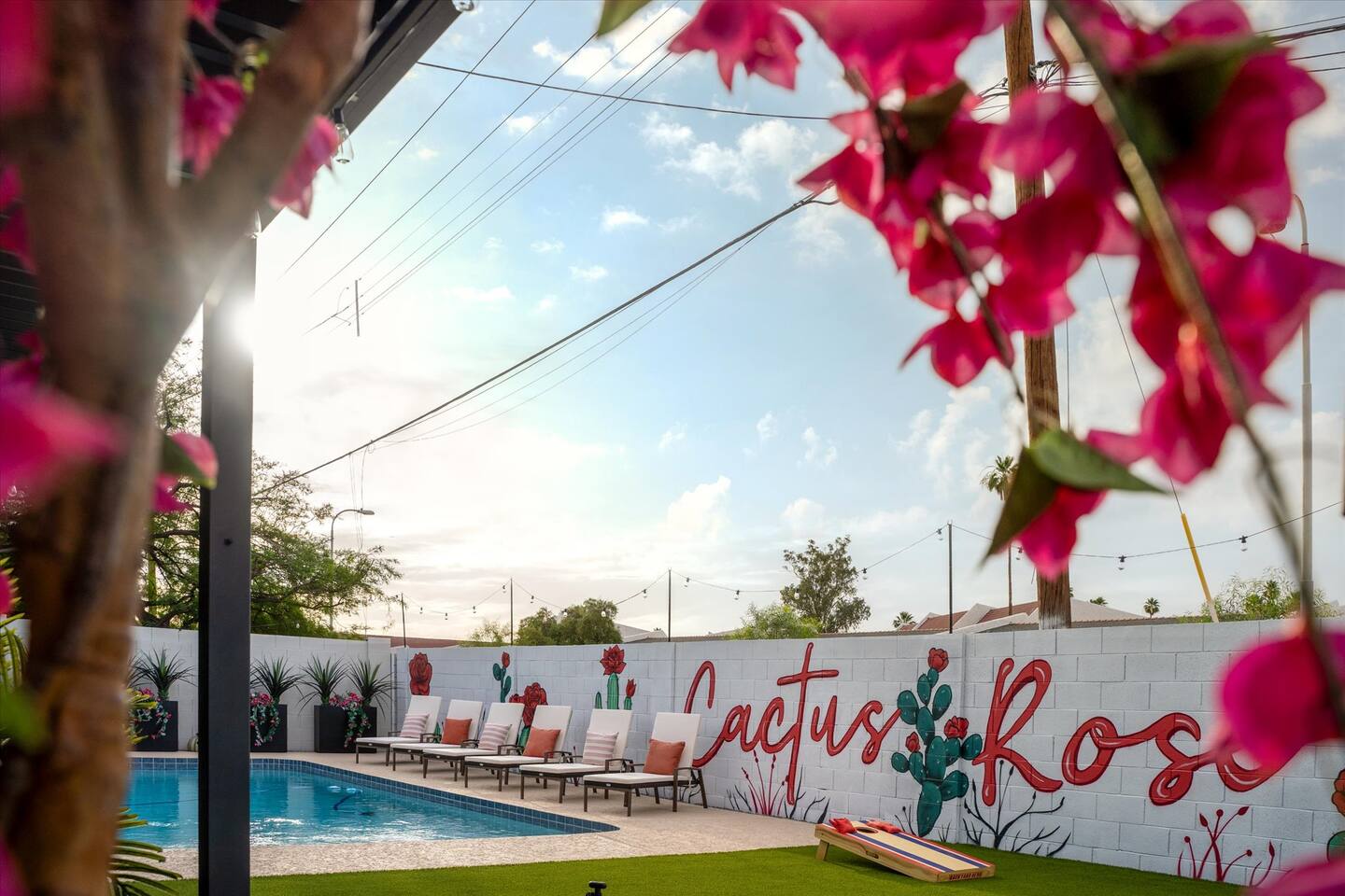 Welcome to Cactus Rose, your dream desert escape in the heart of Tempe, AZ! 🌵 This thoughtfully designed and professionally maintained 5-bedroom home (plus bunk room!) offers the ideal mix of comfort, space, and amenities. Perfect for families, groups, or business travelers. 🛏 Bedrooms: All five bedrooms are styled with modern touches, smart TVs, dressers, and room darkening curtains. • Primary Bedroom: King bed, en suite bathroom, TV, dresser • Bedroom 2: King bed, TV, dresser • Bedroom 3: King bed, TV, dresser • Bedroom 4: King bed, TV, dresser • Bedroom 5: Queen bed, en suite bathroom, TV, dresser — with a secret bunk room tucked into a converted walk-in closet (2 twin beds, perfect for kids!) *We also have 2 air mattresses and bedding available upon request. • Game room: Enjoy a game of darts or poker around our poker table 🍽 Kitchen & Dining: The fully equipped kitchen features stainless steel appliances, a Keurig and drip coffee maker, toaster, and all the cookware and utensils you need. Whether you're prepping a family dinner or serving takeout, this space is ready. Enjoy meals indoors at the large dining table, or head outside to enjoy our gorgeous Arizona evenings. 🧼 Clean & Comfortable: • Professionally cleaned before every stay • Hotel-quality linen service for bedding and towels • Large washer & dryer available for guest use • Central A/C, high-speed WiFi, and a dedicated private workspace 🌵 Outdoor Living: Step into a private backyard oasis built for connection and play! • Private pool and hot tub • Enjoy backyard games! Mini golf on our putting green and Corn Hole with bean bags • Built-in grill • Fire pit, and ample lounge seating • Surrounded by desert landscaping and natural light throughout the home *Please note: Our pool is not heated. It's most comfortable for swimming from May through October. During the cooler months, while the water may be chilly, most days are still perfect for relaxing in the sun on the poolside loungers. 📍 Location Highlights: • 10 minutes to Phoenix Sky Harbor Airport • 10 minutes to Sloan Park (Cubs Spring Training) • 5 minutes to ASU & Downtown Tempe • 15 minutes to Old Town Scottsdale • 20 minutes to Downtown Phoenix HOUSE RULES: 1. Absolutely no parties. We want to be extremely respectful of our neighbors. You will be asked to leave without any refund if there are any reports of noise or partying. 2. No more than 14 people are allowed in the home at any time 3. Quiet hours are 10pm-8am 4. No tape, thumbtacks, or hanging decorations on the walls. 5. We have a zero tolerance NO SMOKING policy. Smoking of all kinds not permitted inside the house. If any evidence of smoking is found, we charge a minimum $500 fee PLUS the cost of restoring the home to its original smoke free condition. 6. NO dogs or pets of any kind. We love pets, but to maintain our high cleaning standards and accommodate guests with allergies, we have a strict no-pets policy. 7. Pool Safety: The pool is not fenced. There is no lifeguard on duty. Swim at your own risk and consider this when deciding if the home is a good fit for your group. By booking, you agree to follow these house rules and respect our home, neighbors, and community. Tempe STR License #A-001198
