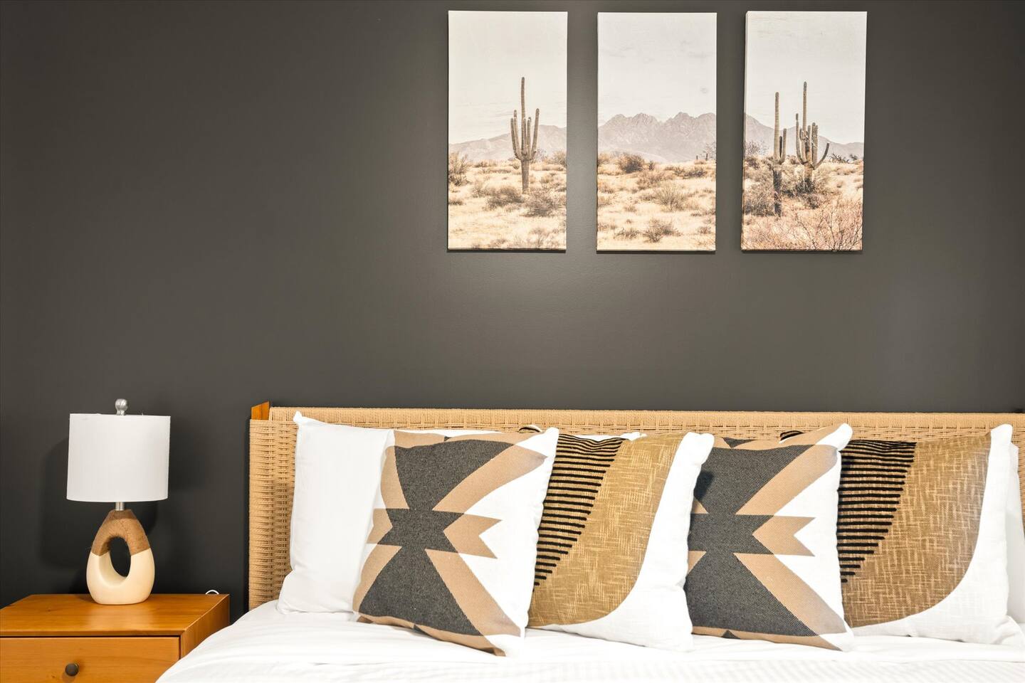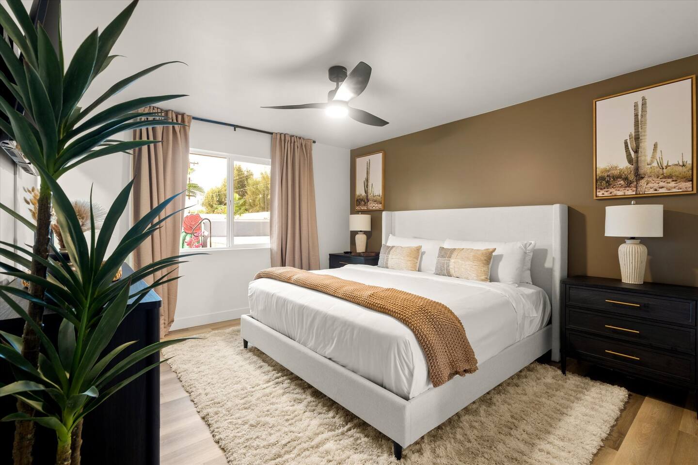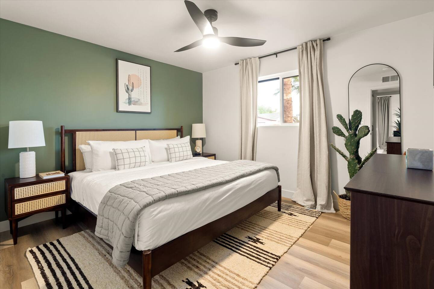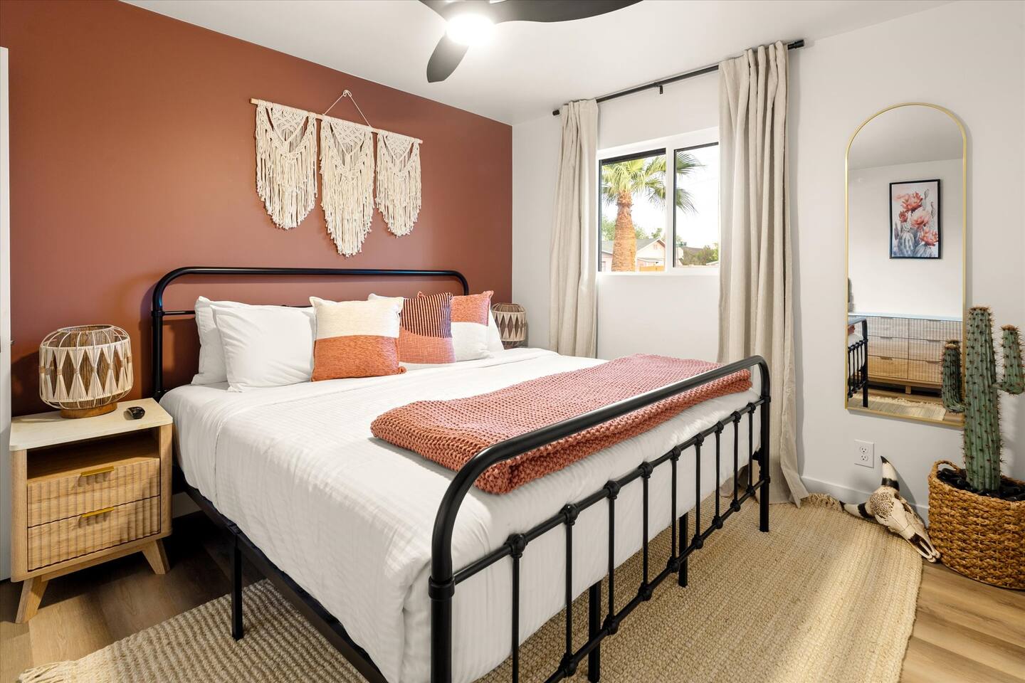 Welcome to Cactus Rose, your dream desert escape in the heart of Tempe, AZ! 🌵 This thoughtfully designed and professionally maintained 5-bedroom home (plus bunk room!) offers the ideal mix of comfort, space, and amenities. Perfect for families, groups, or business travelers. 🛏 Bedrooms: All five bedrooms are styled with modern touches, smart TVs, dressers, and room darkening curtains. • Primary Bedroom: King bed, en suite bathroom, TV, dresser • Bedroom 2: King bed, TV, dresser • Bedroom 3: King bed, TV, dresser • Bedroom 4: King bed, TV, dresser • Bedroom 5: Queen bed, en suite bathroom, TV, dresser — with a secret bunk room tucked into a converted walk-in closet (2 twin beds, perfect for kids!) *We also have 2 air mattresses and bedding available upon request. • Game room: Enjoy a game of darts or poker around our poker table 🍽 Kitchen & Dining: The fully equipped kitchen features stainless steel appliances, a Keurig and drip coffee maker, toaster, and all the cookware and utensils you need. Whether you're prepping a family dinner or serving takeout, this space is ready. Enjoy meals indoors at the large dining table, or head outside to enjoy our gorgeous Arizona evenings. 🧼 Clean & Comfortable: • Professionally cleaned before every stay • Hotel-quality linen service for bedding and towels • Large washer & dryer available for guest use • Central A/C, high-speed WiFi, and a dedicated private workspace 🌵 Outdoor Living: Step into a private backyard oasis built for connection and play! • Private pool and hot tub • Enjoy backyard games! Mini golf on our putting green and Corn Hole with bean bags • Built-in grill • Fire pit, and ample lounge seating • Surrounded by desert landscaping and natural light throughout the home *Please note: Our pool is not heated. It's most comfortable for swimming from May through October. During the cooler months, while the water may be chilly, most days are still perfect for relaxing in the sun on the poolside loungers. 📍 Location Highlights: • 10 minutes to Phoenix Sky Harbor Airport • 10 minutes to Sloan Park (Cubs Spring Training) • 5 minutes to ASU & Downtown Tempe • 15 minutes to Old Town Scottsdale • 20 minutes to Downtown Phoenix HOUSE RULES: 1. Absolutely no parties. We want to be extremely respectful of our neighbors. You will be asked to leave without any refund if there are any reports of noise or partying. 2. No more than 14 people are allowed in the home at any time 3. Quiet hours are 10pm-8am 4. No tape, thumbtacks, or hanging decorations on the walls. 5. We have a zero tolerance NO SMOKING policy. Smoking of all kinds not permitted inside the house. If any evidence of smoking is found, we charge a minimum $500 fee PLUS the cost of restoring the home to its original smoke free condition. 6. NO dogs or pets of any kind. We love pets, but to maintain our high cleaning standards and accommodate guests with allergies, we have a strict no-pets policy. 7. Pool Safety: The pool is not fenced. There is no lifeguard on duty. Swim at your own risk and consider this when deciding if the home is a good fit for your group. By booking, you agree to follow these house rules and respect our home, neighbors, and community. Tempe STR License #A-001198
